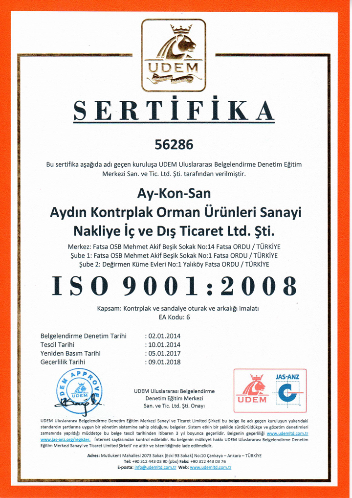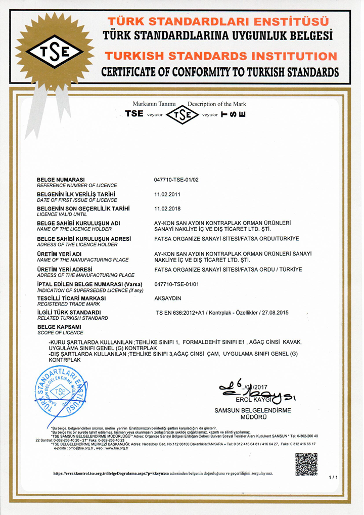 Aydın Kontrplak Sanayii, müşterilerine sürekli en kaliteli ürün ve hizmetleri sunarken sektörünün güvenilir ve tercih edilir şirketleri arasında yer almak amacıyla tüm faaliyetlerini uluslar arası standartlara uygun olarak sürdürmektedir. Bu amaçla tüm dünyada kabul gören yönetim sistemini standartlarına uygun olarak Kalite Yönetim Sistemi, Çevre Yönetim Sistemi, İş Sağlığı ve Güvenliği Yönetim Sistemlerini bünyesinde barındırmakta ve düzenli işlerliğini kontrol ve takip etmektedir.